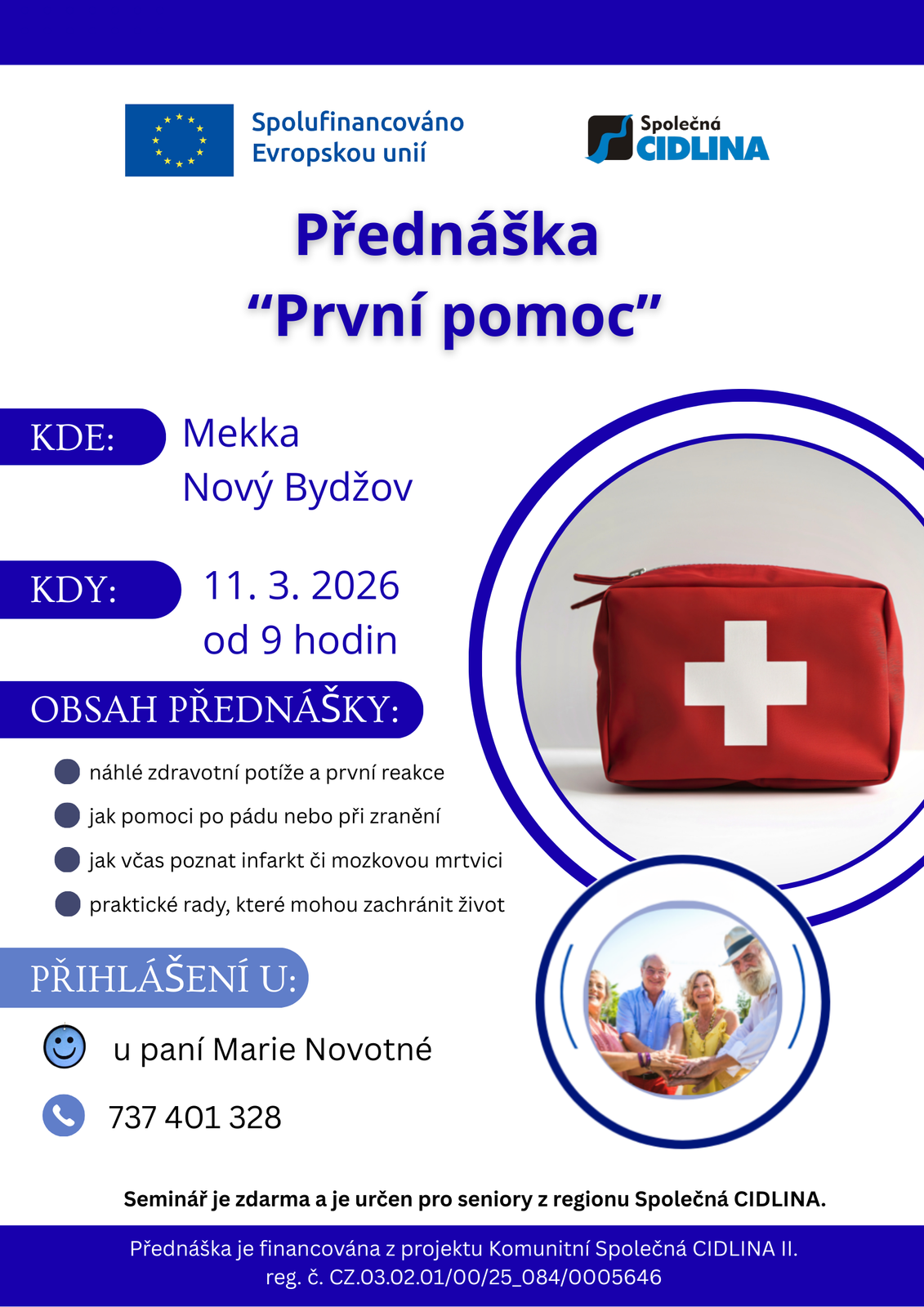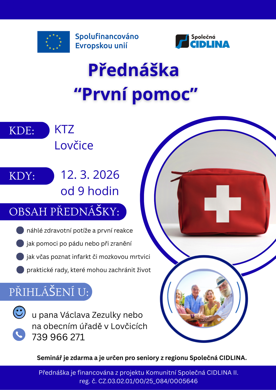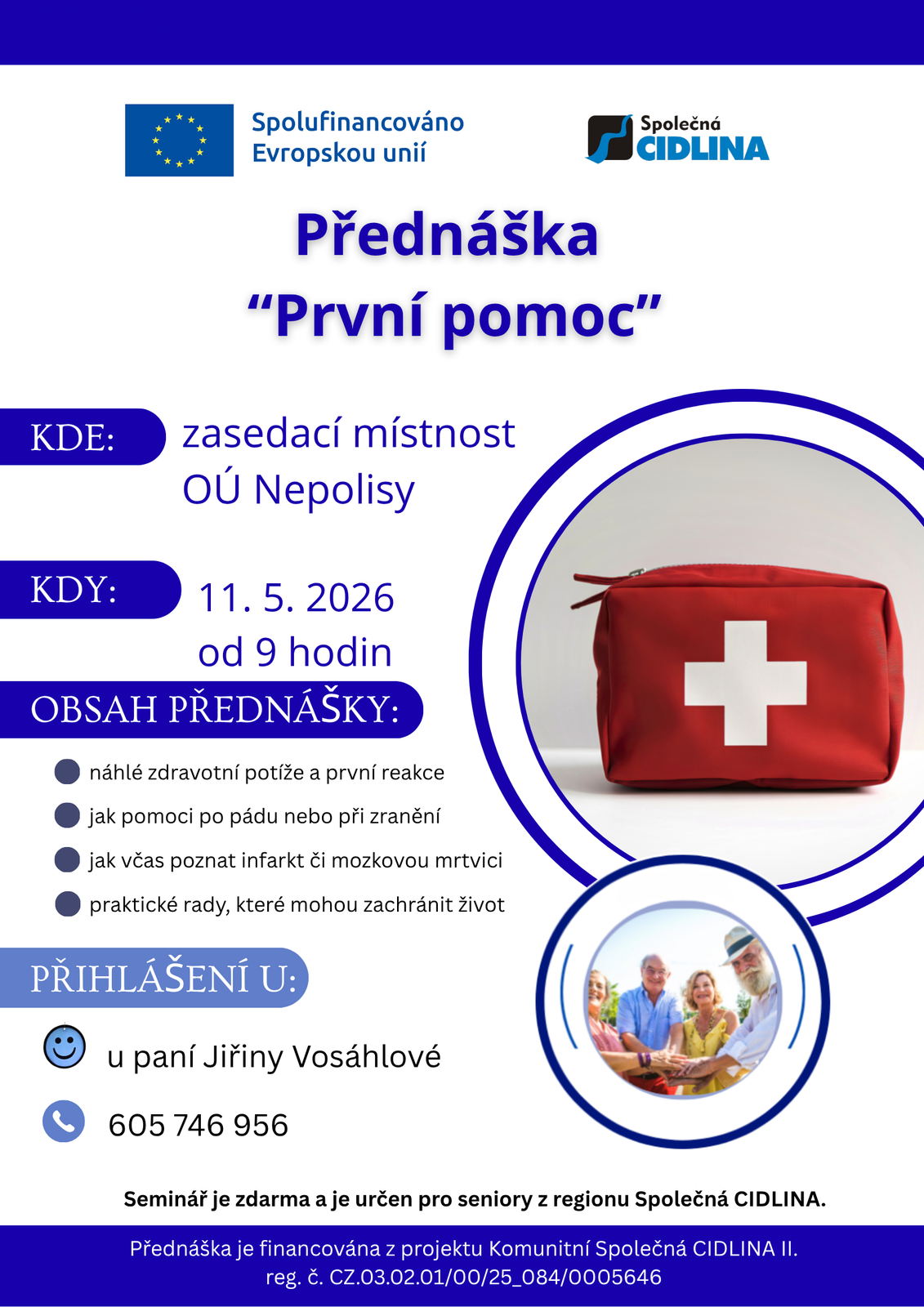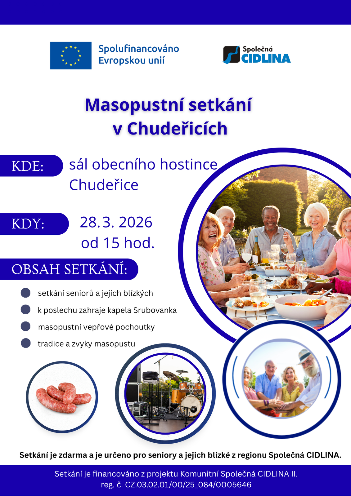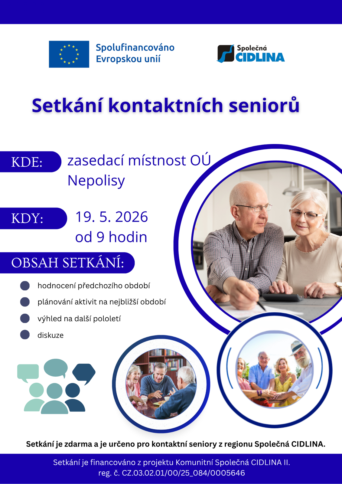 Projekt se zaměřuje na aktivní zapojení seniorů do komunitního života v regionu Společná CIDLINA, zejména těch, kteří žijí osaměle nebo mají omezené sociální vazby. V jednotlivých obcích jsou vytipováni kontaktní senioři, kteří motivují ostatní členy seniorské komunity k účasti na společných aktivitách. Na základě podnětů samotných seniorů budou realizována komunitní setkání, soutěže, přednášky, semináře a besedy, které posílí jejich pocit potřebnosti, sounáležitosti a mezigenerační spolupráce.