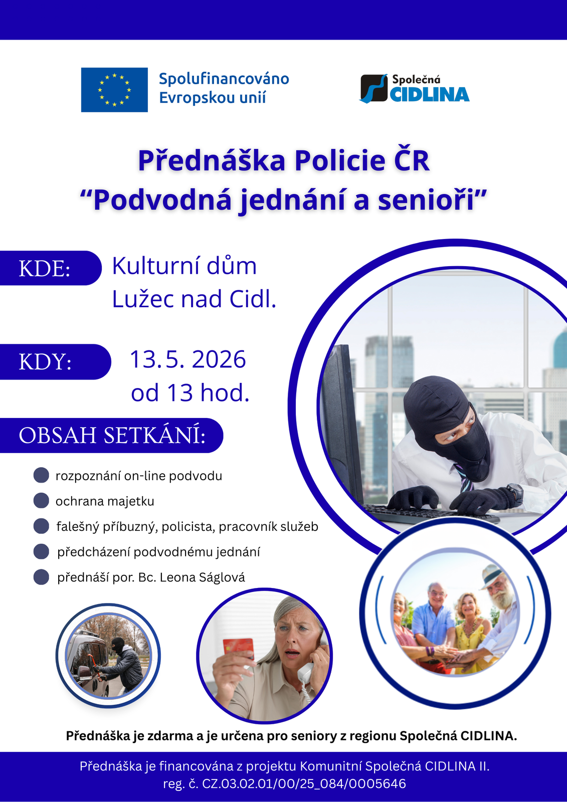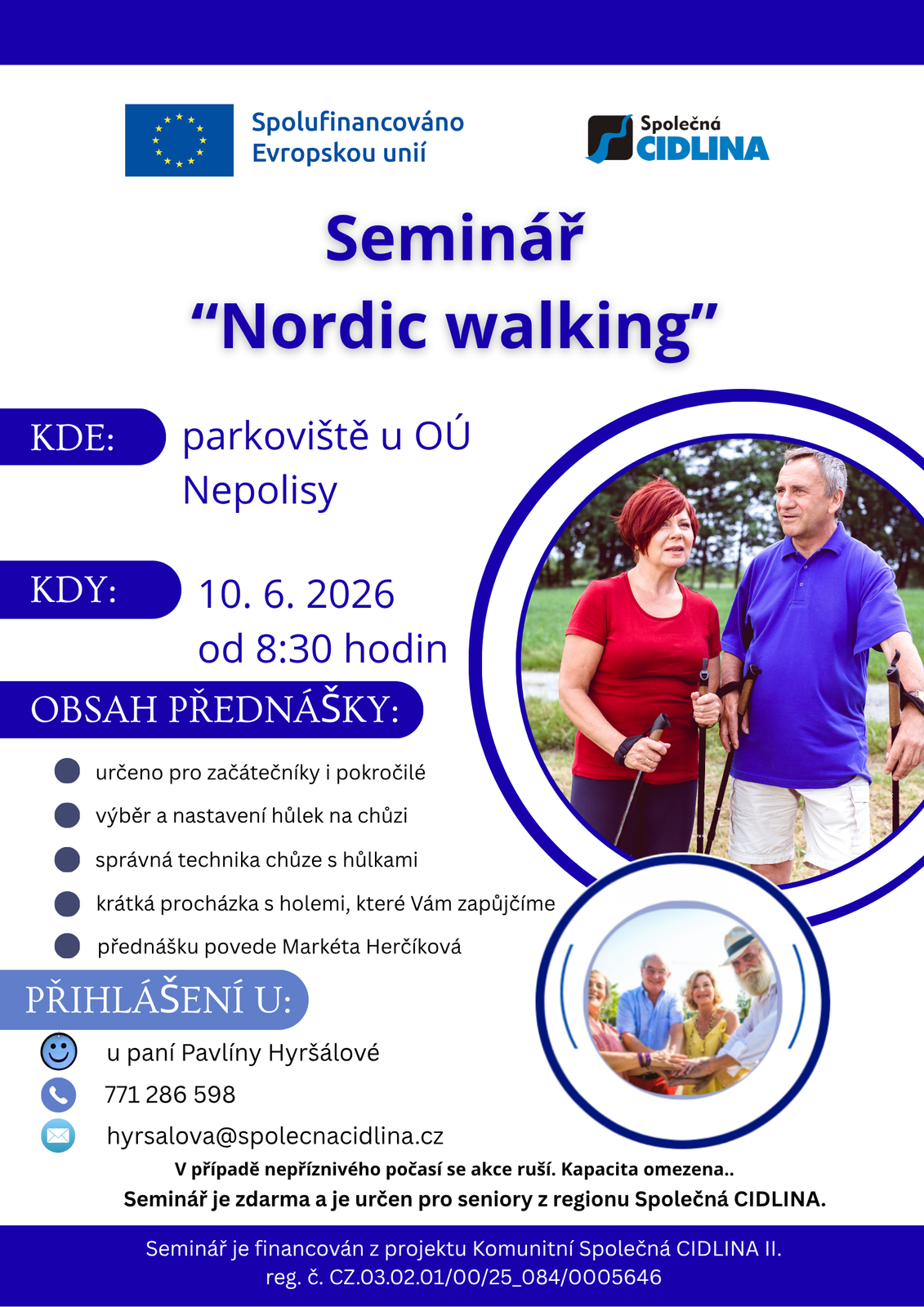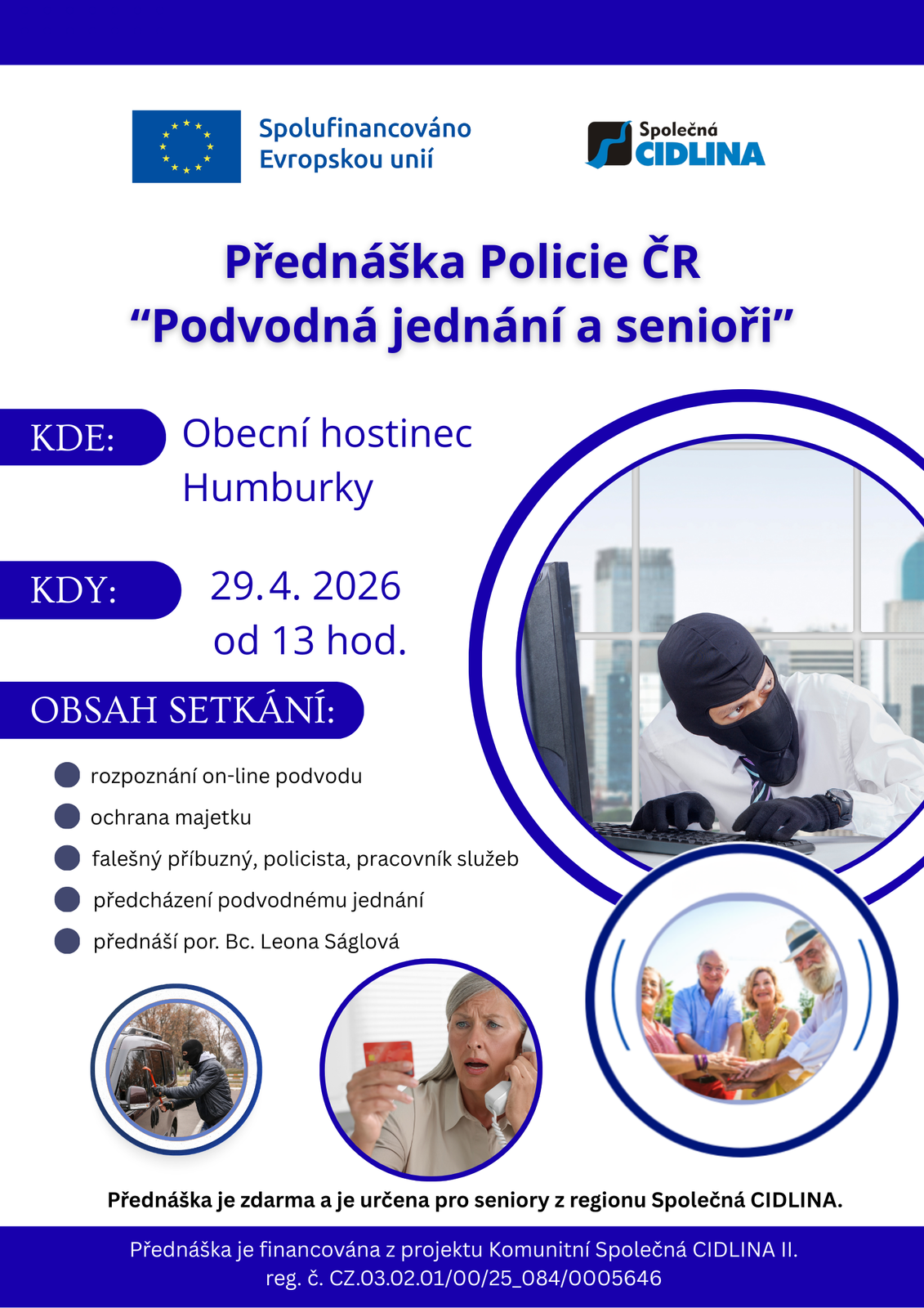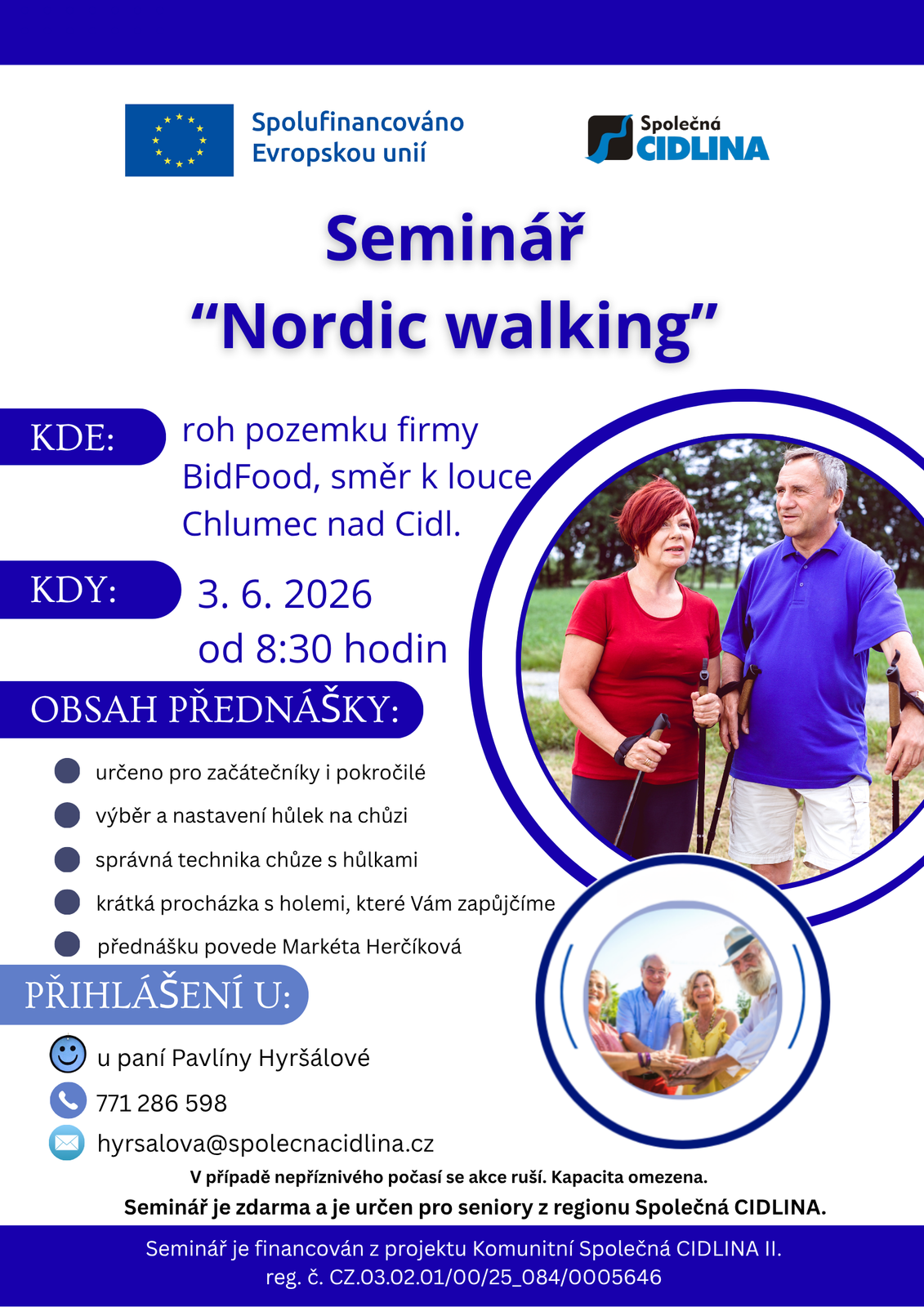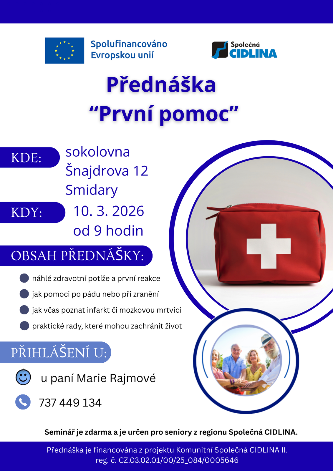 Projekt se zaměřuje na aktivní zapojení seniorů do komunitního života v regionu Společná CIDLINA, zejména těch, kteří žijí osaměle nebo mají omezené sociální vazby. V jednotlivých obcích jsou vytipováni kontaktní senioři, kteří motivují ostatní členy seniorské komunity k účasti na společných aktivitách. Na základě podnětů samotných seniorů budou realizována komunitní setkání, soutěže, přednášky, semináře a besedy, které posílí jejich pocit potřebnosti, sounáležitosti a mezigenerační spolupráce.